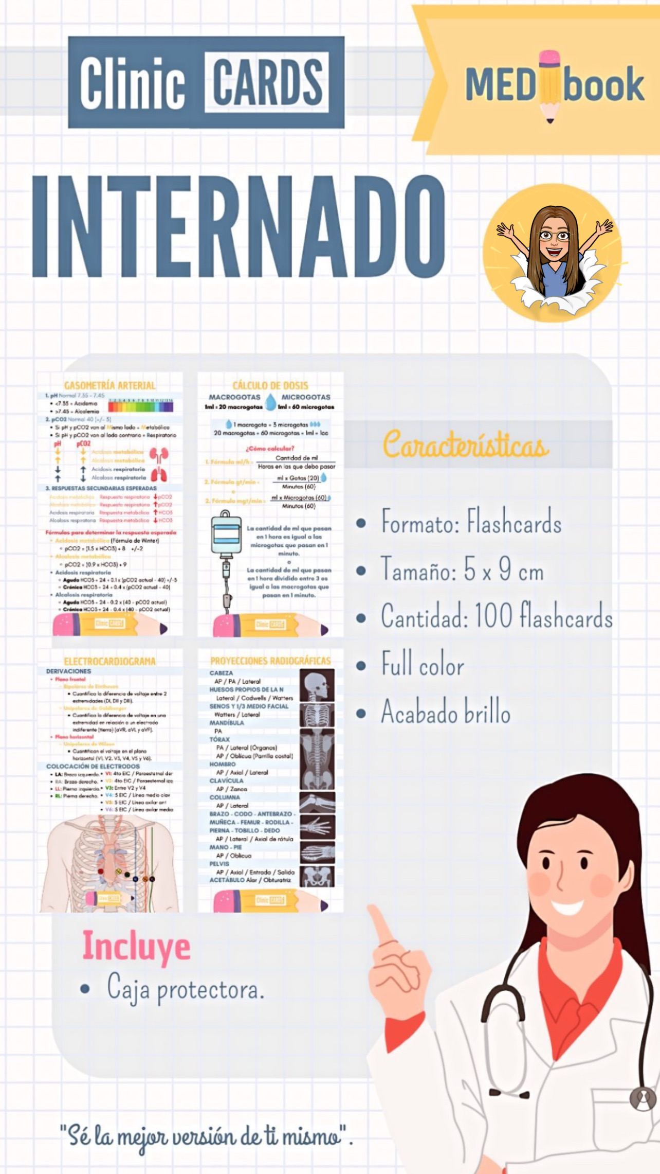 Internado están diseñadas especialmente para estudiantes de medicina en práctica clínica e internado. Contienen 100 flashcards en tamaño 5 x 9 cm, full color y con acabado brillante, que resumen los principales temas de uso diario como gasometría arterial, cálculos de dosis, electrocardiograma y proyecciones radiográficas. Su diseño visual y práctico facilita el repaso rápido en guardias, rotaciones y hospitalización. Incluyen caja protectora que permite llevarlas siempre a mano.