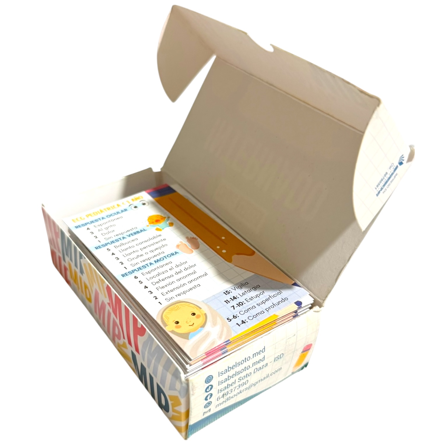Set de 100 flashcards para internado médico, tamaño bolsillo (5 x 9 cm), full color con acabado brillante y caja protectora.