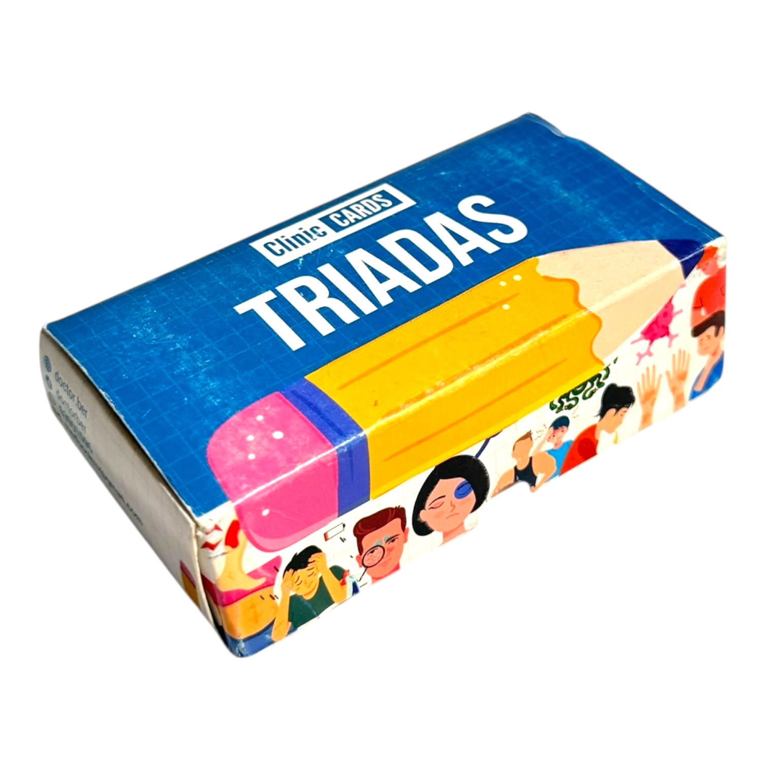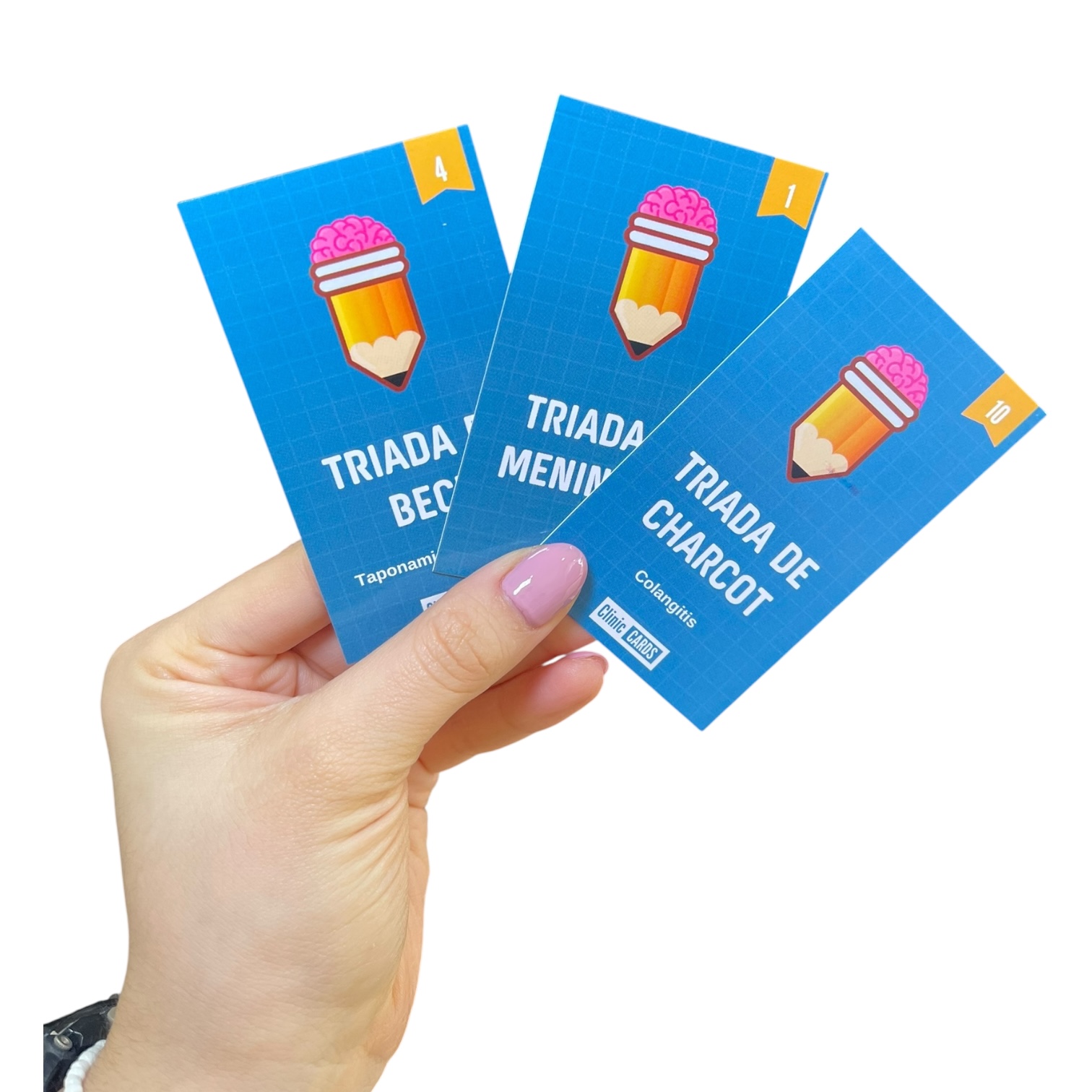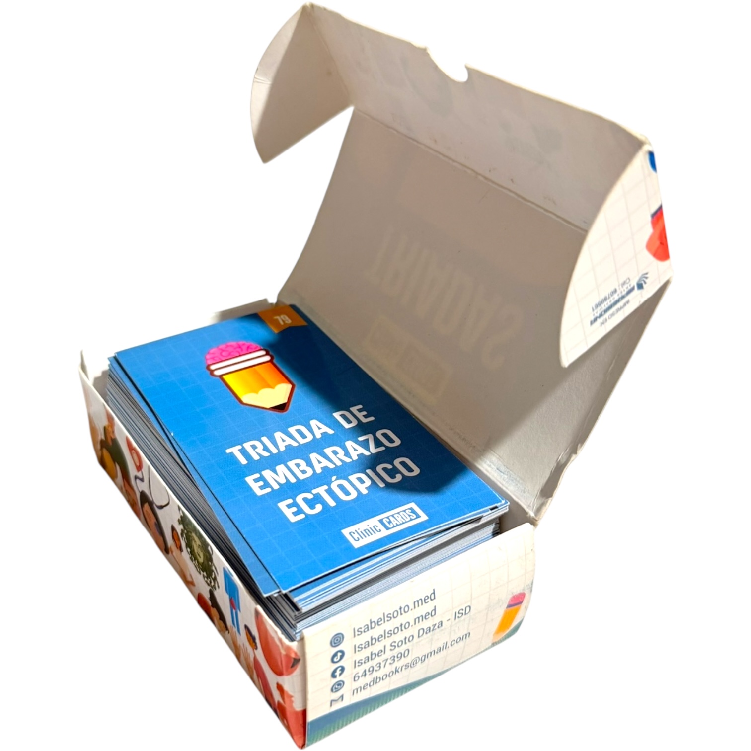 Set de 90 flashcards de tríadas médicas, en tamaño bolsillo (5 x 9 cm), full color y con caja protectora. Ideal para estudiantes de medicina y profesionales de la salud.